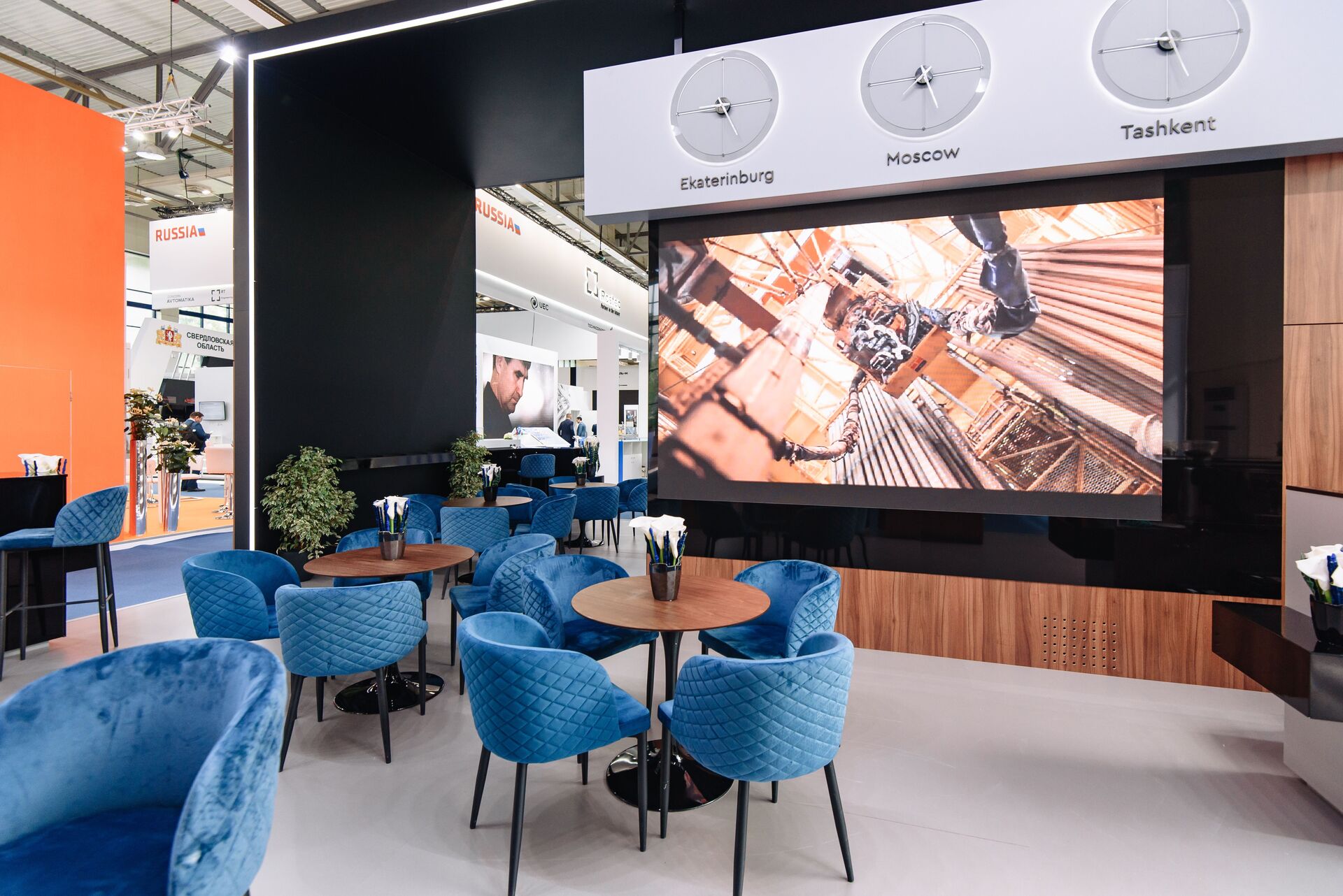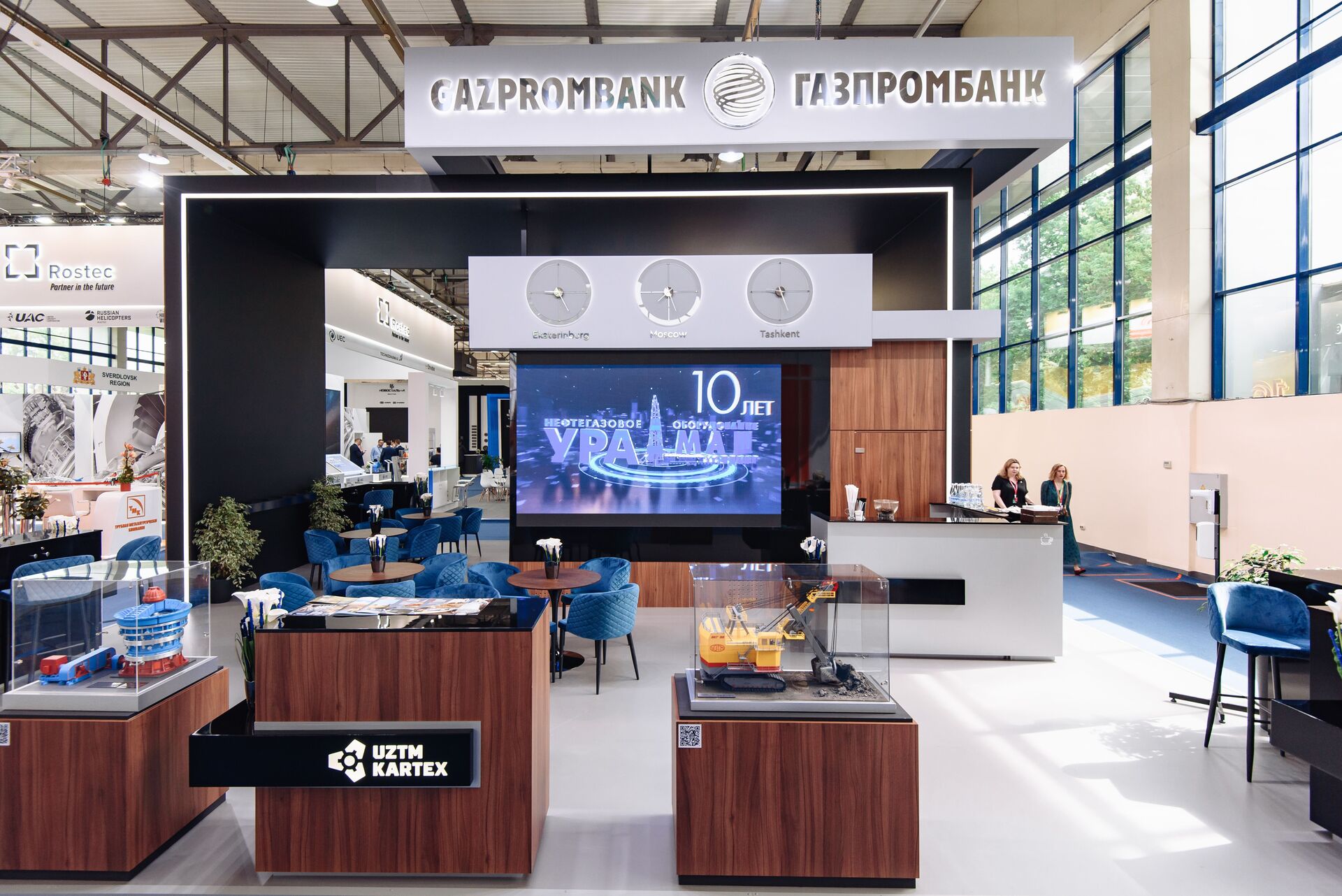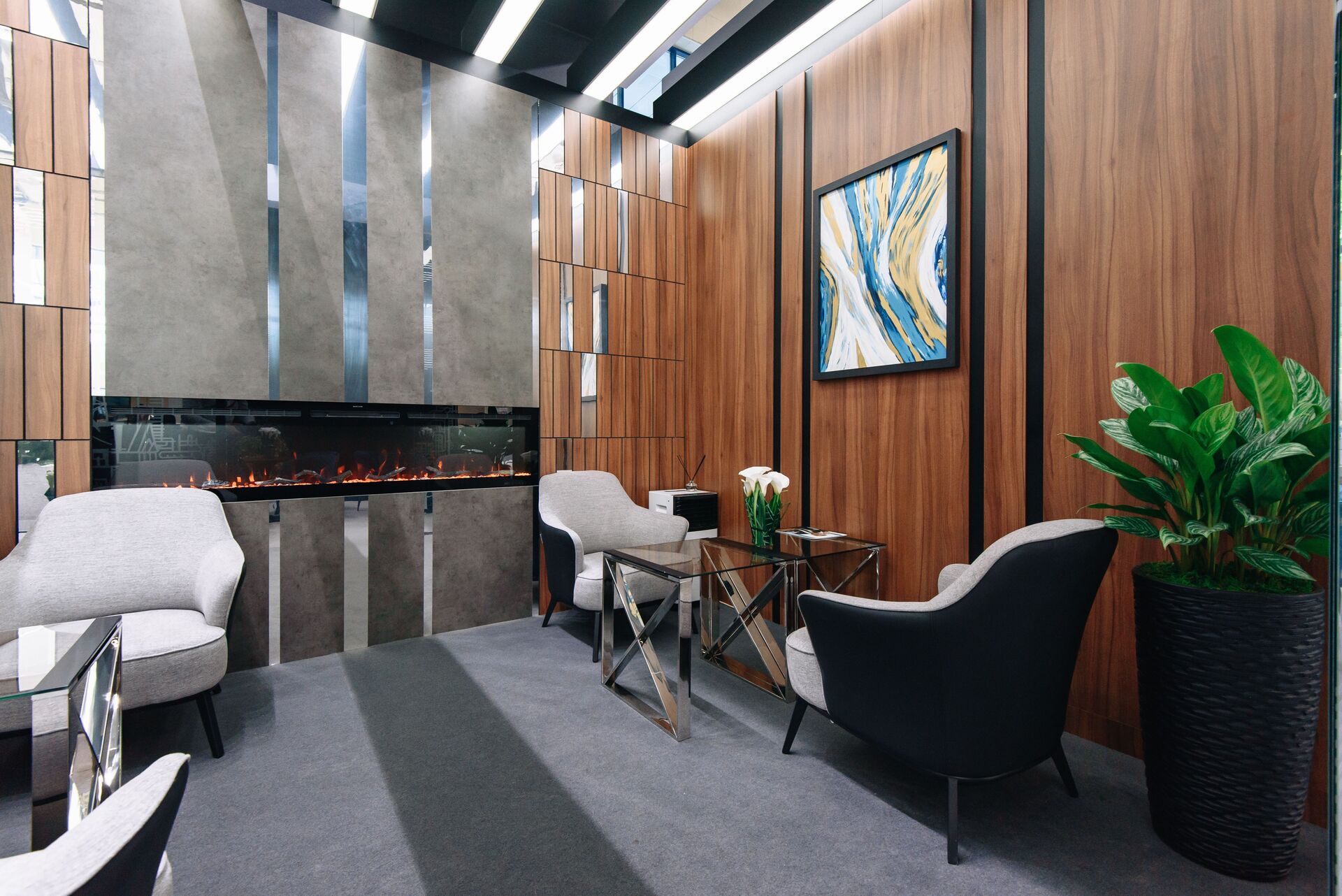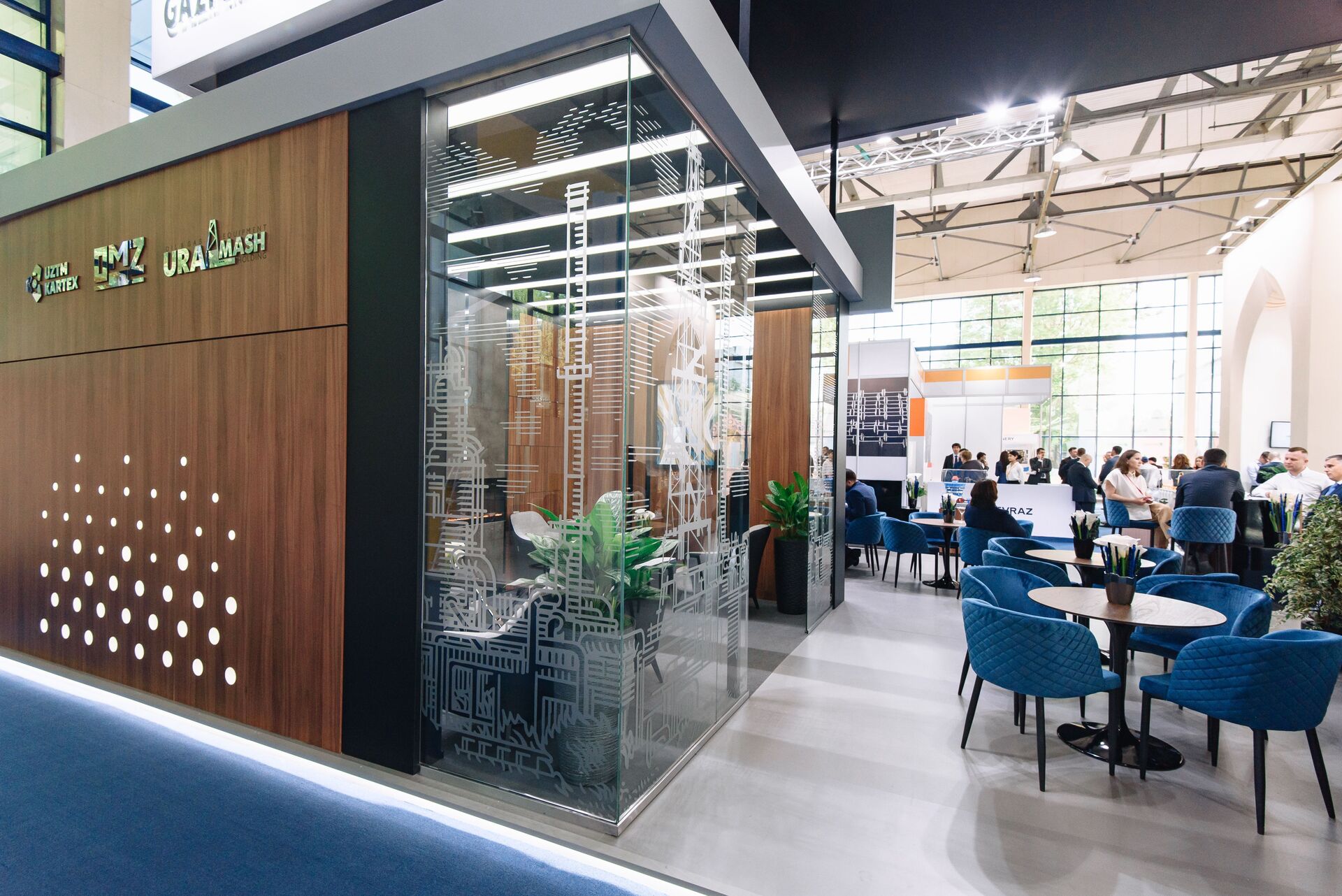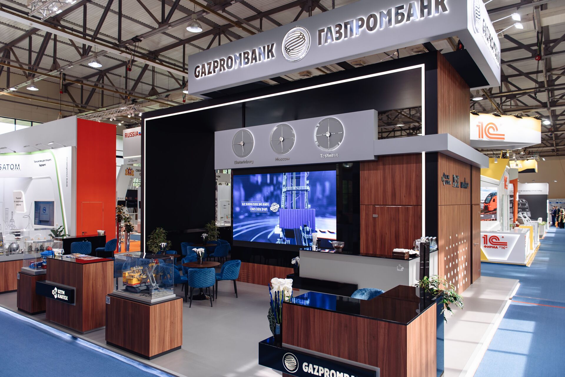 Для вау-эффекта мы использовали светодиодные экраны, дополненные зеркальными поверхностями, — они усилили визуальное восприятие и создали запоминающийся образ для посетителей выставки. Внутри стенда было организовано стильное и удобное лаунж-пространство, где гости могли отдохнуть и провести переговоры в комфортной обстановке.