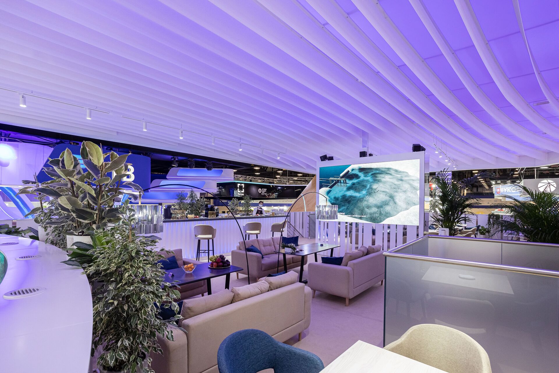 Выставочная экспозиция, в основе которого монументальная конструкция, заметная со всех входов павильона, с огромным светодиодным экраном на входе. Внутреннее пространство представлено закрытыми переговорными комнатами для комфортных встреч, второй этаж в виде открытого лаунжа, где расположены удобные посадочные места для VIP гостей мероприятия.