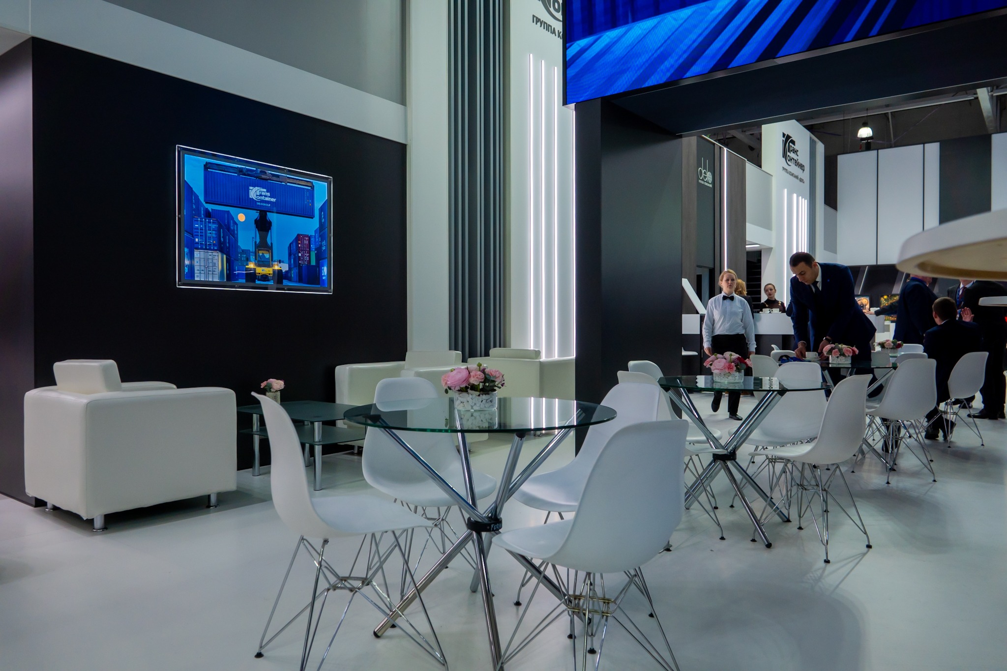 Мы создали стенд с лаконичными формами, в котором монументальные фактуры объединились со стеклянными поверхностями, придавая пространству современный и стильный облик. Для привлечения внимания к стенду мы разместили большой панорамный экран так, чтобы его было видно от входа — это позволило привлечь внимание посетителей с первых минут и невербально пригласить их на нашу площадку.